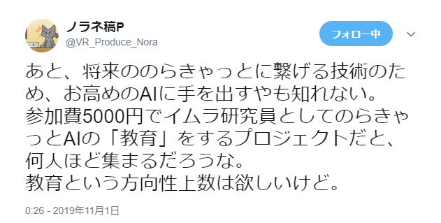 参加費5000円でイムラ研究員としてのらきゃっとAIの「教育」をするプロジェクトだと、何人ほど集まるだろうな。