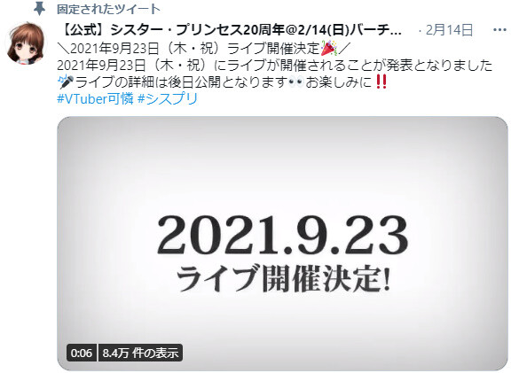 — 【公式】シスター・プリンセス20周年@2/14(日)バーチャルライブ開催! (@sis_pri20th) February 14, 2021