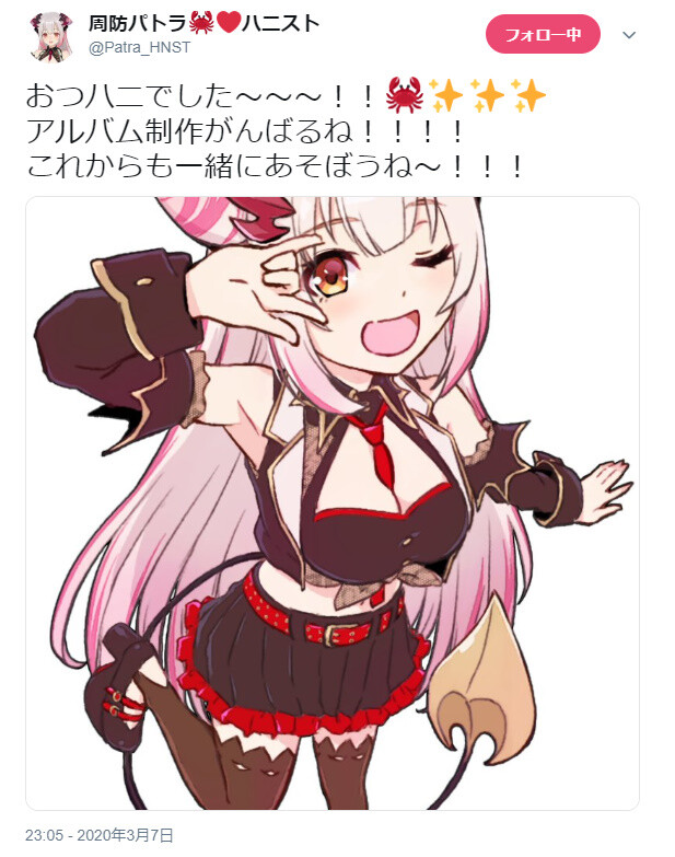 — 周防パトラ🦀❤️ハニスト (@Patra_HNST) 2020年3月7日