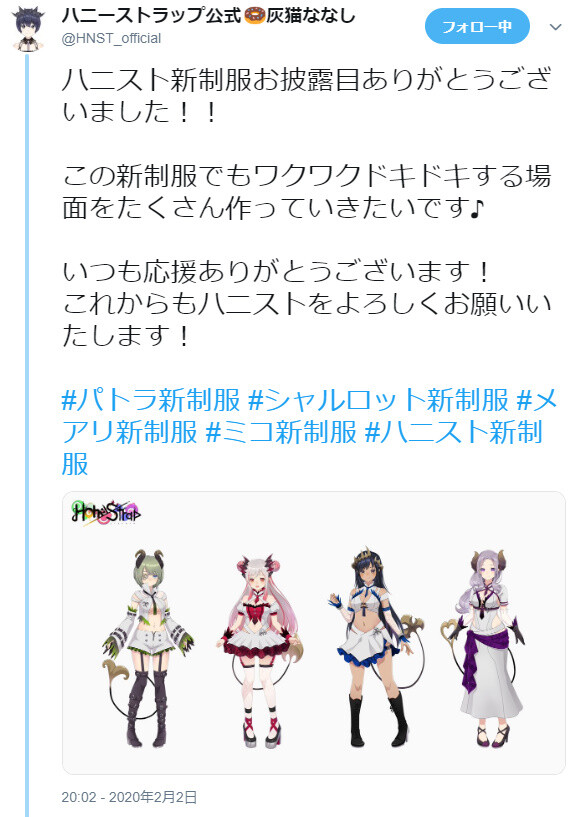 ハニスト新制服お披露目配信は2/2(日)の18:00から30分ずつで発表していくよーーー!!!!🔱
