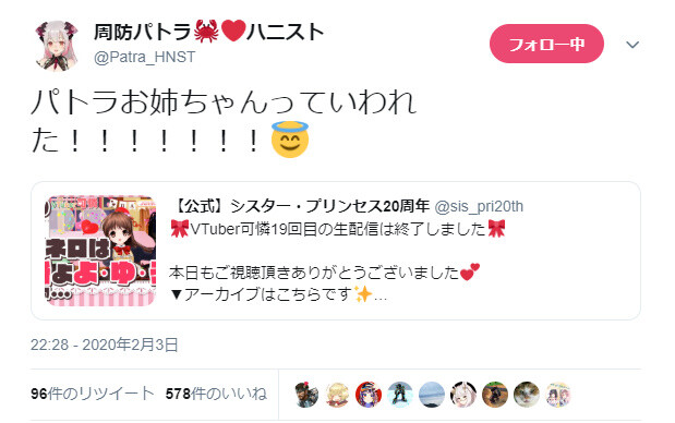 — 周防パトラ🦀❤️ハニスト (@Patra_HNST) February 17, 2020