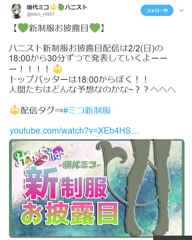 — 堰代ミコ🔱🍏ハニスト (@Mico_HNST) 2020年1月31日